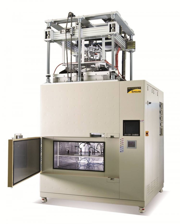 The SEC 10 SUN is part of the Solar Technology by Atlas market approach offering integrated, ready-to-use test chambers for various solar and environmental applications. The product combines environmental simulation with metal halide lighting technology. The SEC 10 SUN chamber is a very high solar intensity test instrument for accelerated testing. Moving 4 MHG luminaries up and down to high precise linear and angular positions, the SEC 10 SUN instrument offers an adjustable solar irradiation range from 1000 W/m2 to 10000 W/m2. Mini module cells up to 40 cm x 40 cm can be tested on an exposure plane of 1600 cm2 following uniformity Class B.