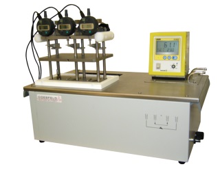 Penetrometer to measure the indentation hardness of polymeric coated pipes and formed parts under influence of weight and temperature.
