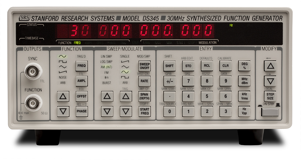 The DS345 Function Generator is a full-featured 30 MHz synthesized function generator that uses an innovative Direct Digital Synthesis (DDS) architecture. It generates many standard waveforms with excellent frequency resolution (1 µHz), and has versatile modulation capabilities including AM, FM, Burst, PM and frequency sweeps. It also generates arbitrary waveforms with a fast 40 Msample/s update rate.