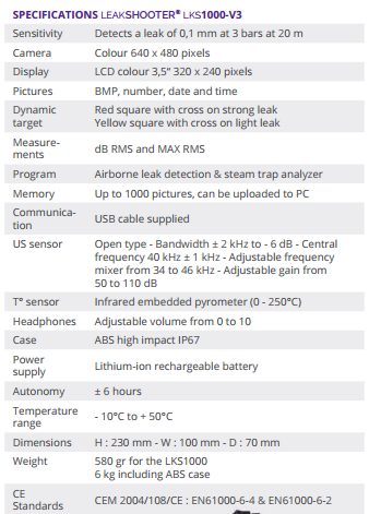 Ultrasonic compressed air, gaz and vacuum leak detector with camera. Compressed air is a costly form of energy and 20 to 40% of it is lost through leaks. Systematically checking for and eliminating leaks can therefore bring considerable energy savings. Film, view and photograph the precise spot where compressed air, steam, pressurised gas and vacuums are leaking using the LEAKSHOOTER LKS1000-V.2. The LEAKSHOOTER LKS1000-V.2 is a sophisticated tool. Extremely sensitive, it is capable of finding all leaks, even the smallest, including those no bigger than the size of a syringe needle, at a distance of 15 metres. Leaks can be detected in all types of industrial environment thanks to the possibility of adjusting the gain on the device to filter out all undesirable noise. The LEAKSHOOTER LKS1000-V.2 is used like a camera. When it comes near a leak, a dynamic yellow target appears on the large colour screen. The target turns red and shrinks as it approaches the source of the leak. A bar graph at the bottom of the screen accompanies and facilitates the search. When the device is facing the leak, a cross appears in the centre of the target. It is then possible to photograph and save the precise location of the leak.