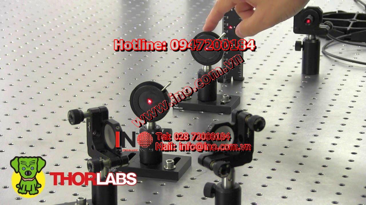 Thorlabs demonstrates two techniques for aligning a laser beam to travel parallel with the optical table. The first technique assumes the tip and tilt of the laser’s pointing angle can be adjusted and uses a ruler to level the beam and direct it along a row of holes in the table. The second technique assumes the angle of the input laser beam is fixed. Two turning mirrors and two irises are used to level the beam and direct it along an orthogonal row of holes in the table.