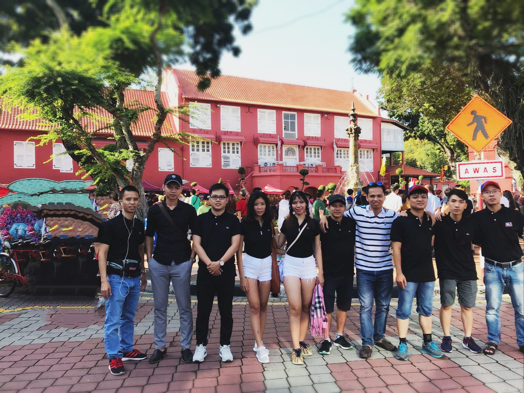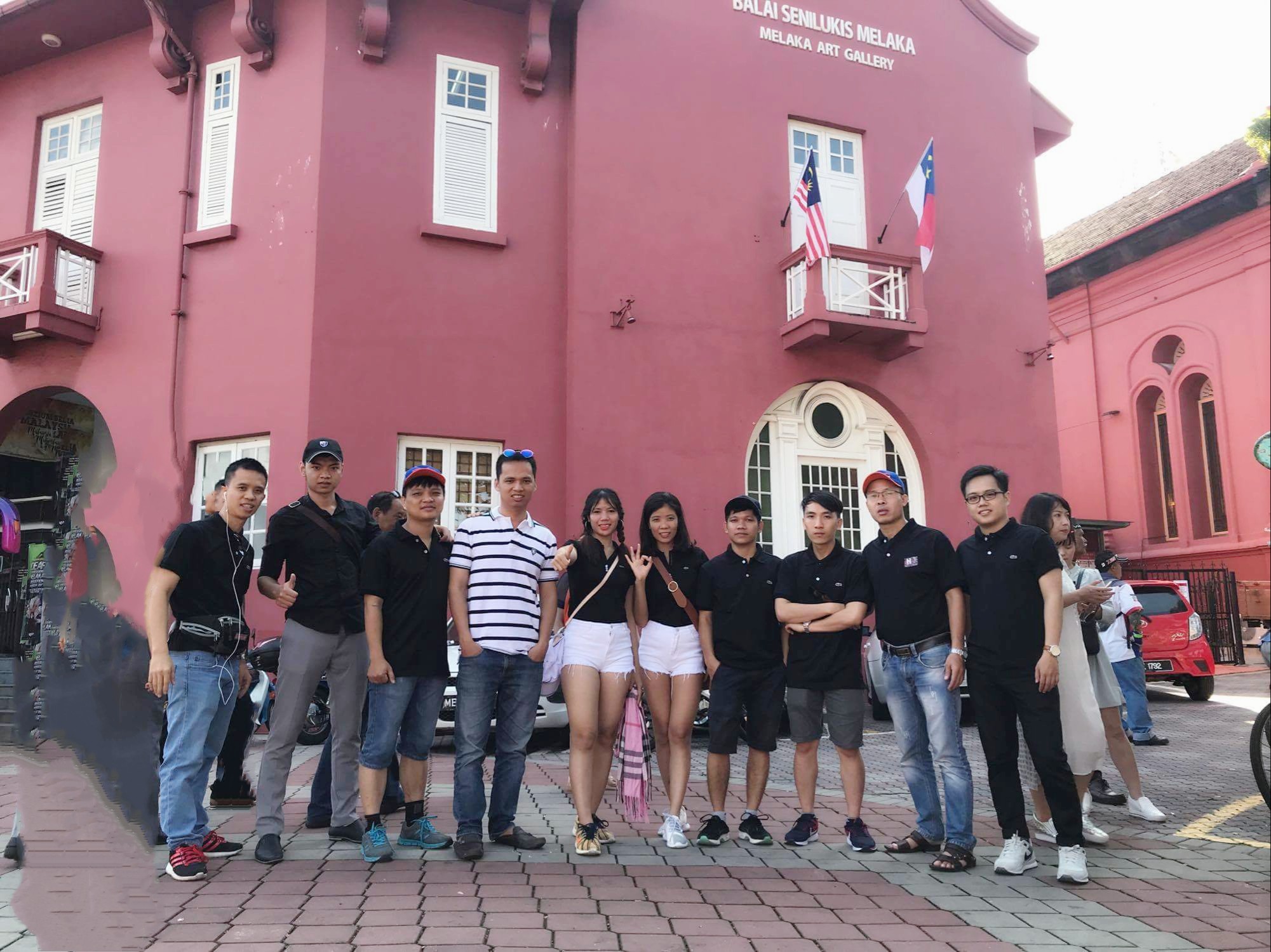 Mọi người chụp hình kỷ niệm tại Quảng trường Hà Lan, còn gọi là Stadthuys, trong tiếng Hà Lan cổ, có nghĩa là tòa thị chính hoặc quảng trường Đỏ, nằm ở ngay trung tâm Malacca, Malaysia