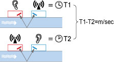 | Ultrasonic waves are transmitted into a liquid alternately from the 2 sensors attached to the outside of the pipe, and difference between the propagation time of the ultrasonic wave in the upstream direction and the propagation time in the downstream direction is detected to obtain the flow velocity. Then, the flow rate is calculated by multiplying the cross section area of the pipe diameter. |