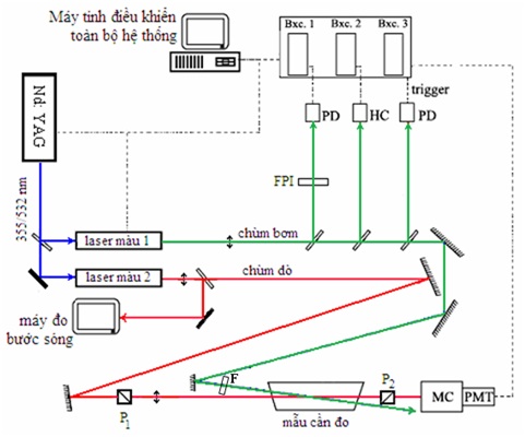 Các tín hiệu từ ống nhân quang điện, từ đèn Hollow cathode, và giao thoa kế Fabry-Perot đồng bộ hóa qua ba bộ tích phân boxcar loại SR 2245 của hãng Standford Rerearch Systems (hình 3).